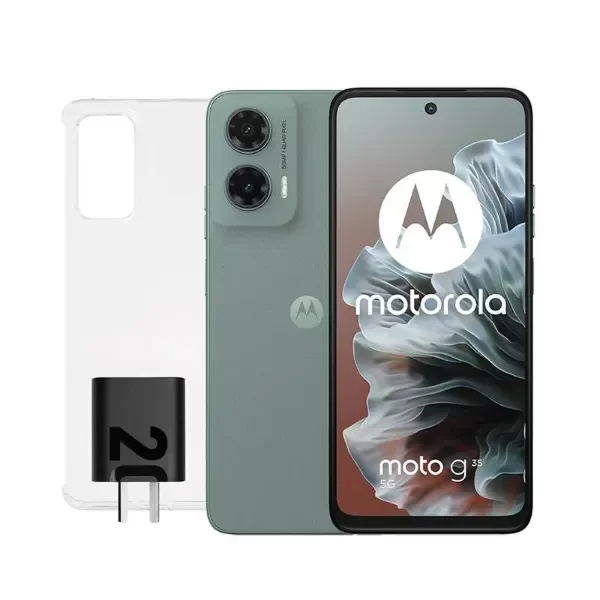 El Motorola Moto G35 cuenta con una pantalla FHD+ de 6.72 pulgadas y refresco de 120Hz. Por dentro, encontramos un procesador Unisoc T760 con hasta 8GB de RAM y 256GB de almacenamiento interno y una batería de 5000 mAh que soporta carga rápida. Su cámara posterior es dual, con un sensor wide de 50MP y un ultrawide de 8MP, sumando una cámara selfie de 16MP al frente. El Moto G35 completa sus características con parlantes stereo, lector de huellas lateral, resistencia a salpicaduras, y Android 14.