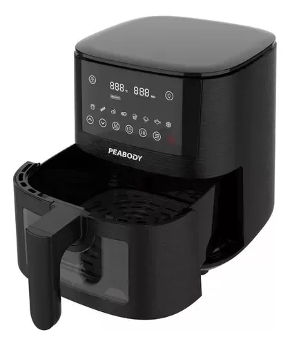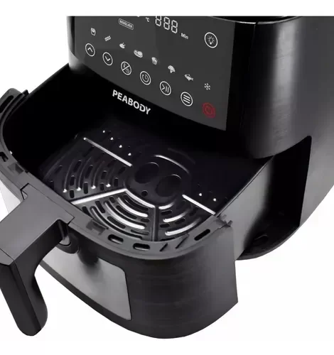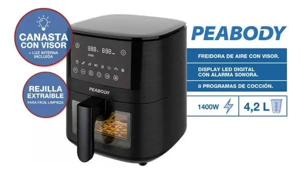La freidora Peabody cuenta con 8 programas de cocción: Papas fritas, Panceta, Aves, Carnes, Hornear, Vegetales, Pescados y Descongelar + función manual. Por otro lado, posee función mantener caliente hasta 1 hora y timer de 1 a 15 hs.Diseño